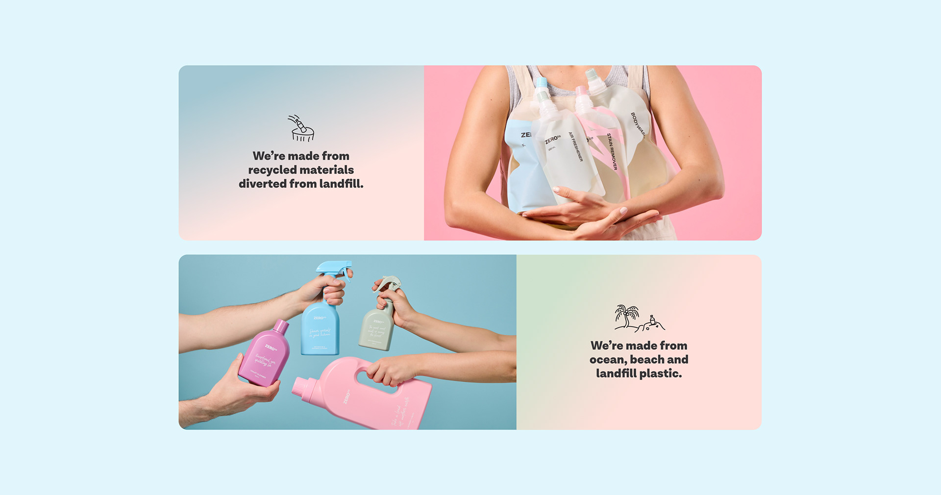 Zero Co is changing the way we clean our homes and our bodies. Back in 2019, they came to us to kickstart their brand presence, and solidify their place in the market. Filled with playfully engaging messaging and imagery, the result is a brand that deals with a serious subject (waste) in a positive way. No fear-mongering here.